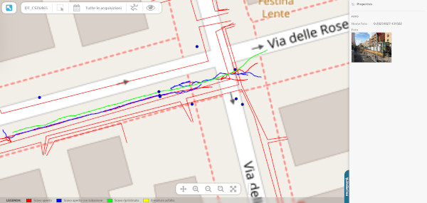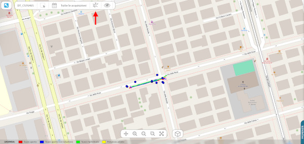Oltre al grafo della LCL sono visibili le tracce dei rilievi acquisiti (traiettorie eseguite dal telefono durante l'acquisizione) e per i quali è stato eseguito l'upload.