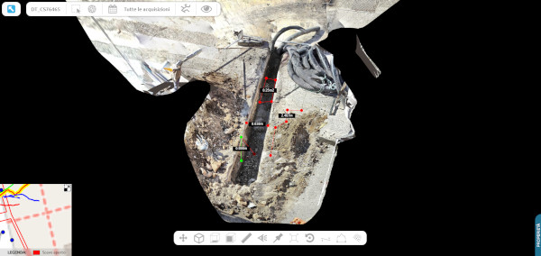 Cliccando su un punto azzurro nella barra laterale vengono mostrate la foto, le informazioni e le misure calcolate dal software riferite al rilievo fotografico.
